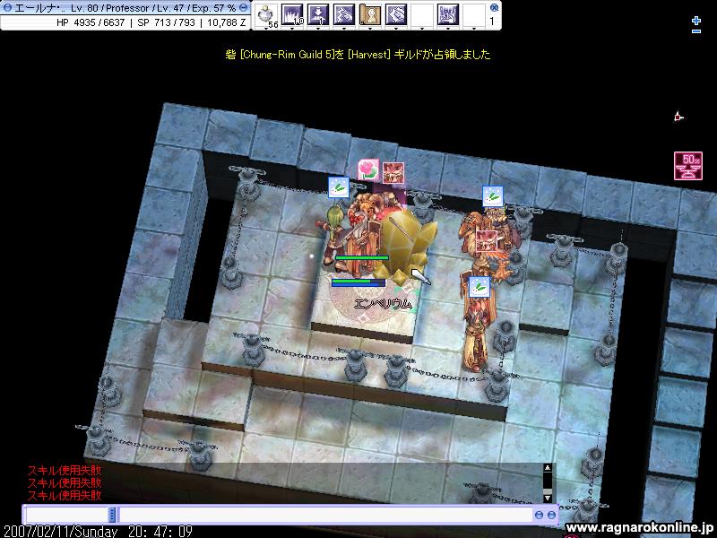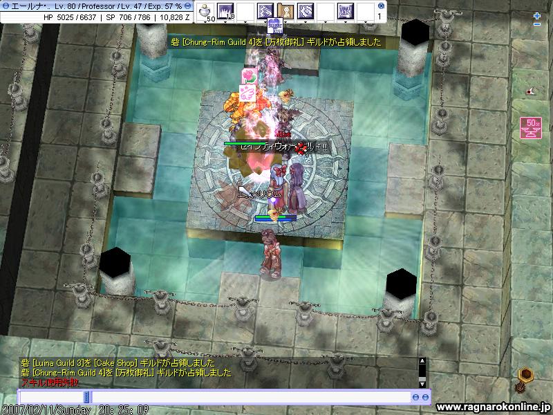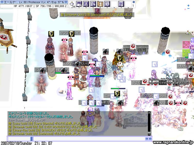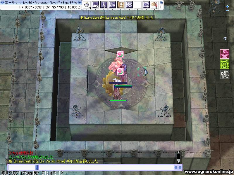 出た面子はいつものメンバーで、LK、AX、教授 今回はプリがいなかったのでちょっときつかったかな・・ とりあえず最初はAXの人は別行動とのことで、LKと私だけでルイーナを回ることに 回った順番などは覚えていないで適当に! とりあえず最初に落としたのがL1 二人だけだったので防衛は微妙かなぁとも思いましたが、とりあえずやってみることに 普通にLKがバーサークで一人ずつ落としてくだけなんですが、やはりというかLKは落とすのはきついようでしたかな 私はディスペルとエンペにSWくらいしかやってません Gvやってて初めて状態異常武器とかソドブレとか欲しいなぁと思った日でした。 それで防衛はというと、何やら途中でSKのマスタであるAXさんが防衛を手伝ってくれて意外と防衛できた感じ とりあえず思い出してSS取るものの、このすぐ後だったかにバフォのAXが割ったような気がします 次いでいろいろと攻めて、L3へ 攻め時のSS 防衛してるのが白うさぎのエンブのとこで、攻めてるのが私たちときのこのエンブのとこ 驚いたことにこっちもLKと教授のペアで、向こうもLKと教授のペアでした 何だか親近感が! でもこの時はラビがブレイク その後にAXの人と合流し、再びLを回ることに しかしなかなか落とせずに・・ そんな時ラスト10分あたりでL2をブレイク しかし3人だけじゃすぐ落とされるだろうし、武器も壊されたとのことなのでリログして次を狙うことへ ここで私がサバキャンにあって5分くらい入れなかったり 入れた時にはL2には多くの外征 転進するものの、ラグなどで思うように動けないまま時間が過ぎていき結局そのまま終了 最後がちょっとだけ消化不良だったような 落とされてもいいから防衛しとけばよかったかなぁと少し後悔 すみませんでした。 とりあえず何が言いたいかというと、プリがいない分いままでで一番経費使いました・・ 今度からプリいなかったら私が引っ張り出そうかな。 おつかれさまでした! バトンなんて踏んでも絶対やる気がなかったのですが、何かステラさんのとこで名指しされてしまった!
