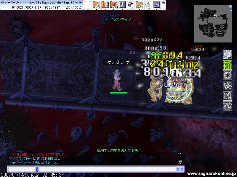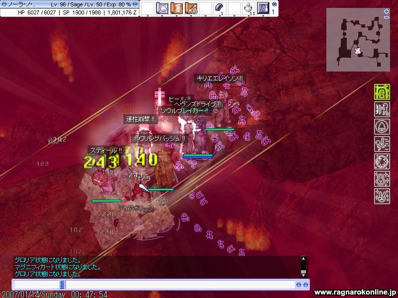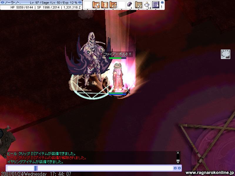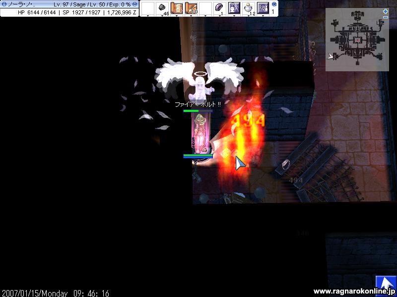 行き先は火山2Fでした まずは先にいたPTに合流しようとしたのですが、飛ぼうかと思ったけれどどうせなので歩いていくことに 何だかここはMDEF高かったり属性バラバラだったり闇もいたりと、セージじゃ狩れないだろうなという先入観がありました しかし進んでいって分かったことは ナイトメアテラーと沸きをどうにかすれば、狩れなくもないんじゃないかと。 沸きはどうにでもなりそうですが、問題はナイトメアテラー HPも高く闇3だったりもするのでFB10で平均1,5kくらい?さすがに無理そうです 結論はセージじゃちょっときついかと。 でも教授になったら、どれくらいになるか次第で何とかなるかもしれません! と、馬と交戦しているうちに、気づいていたのかみんなが来てくれて無事合流。 そこにいたメンツは覚えてなかったけど10人くらいかな? 鳥がいてくれたので、ブラギに乗っての魔法連発は気持ちよかったです。 とまぁ来る時間が遅かったために、ほどなくして終了。 その後たまり場でまったりしてると、雪崩さんから狩りのお誘いが。 どこに行くかということで、前回は亀でしたが今回はジュピ1を提案。 多分亀より危険だろうなとは思いましたが、とりあえず行ってみることに ここでもプリを前にしてひたすらHD殲滅 地ヴェナートが二体か三体くらい残ったら、FBを適当に撃つことに 自分にタゲが来たらハイドで移すということですが、これがまた難しかったです 敵にダメくらったりして、隠れる前に解けてしまいます きっと私が下手なのですね! それなのでSW出してからハイドをすることに。 意外と順調に進みながらも、1時間弱が経ったころ かなりの数がいて、プリが死んでしまいました SW置いたと同時に死ぬのは何だか悲しいですね 置いても1秒で消えて結果は変わらなかったかもしれませんが。 でも50分ほどの狩りで、2%ちょいUP 計算すると1.2M/hくらい出ていたらしいです 亀よりもスリルはかなりあるので、楽しかったです! 是非ともまたご一緒させてくださいませ。