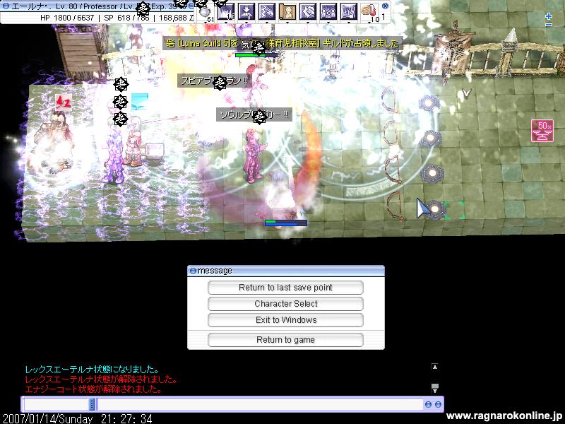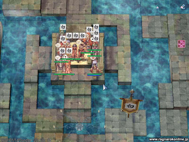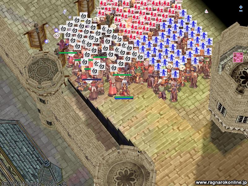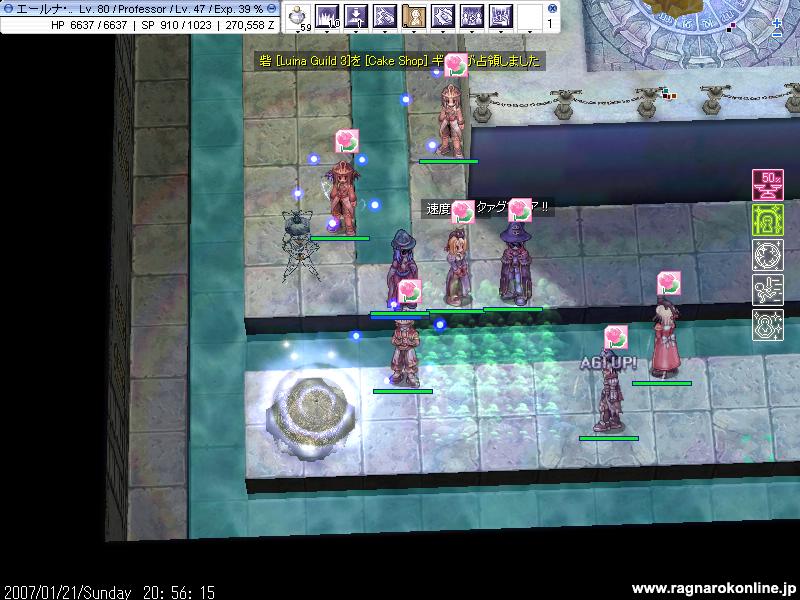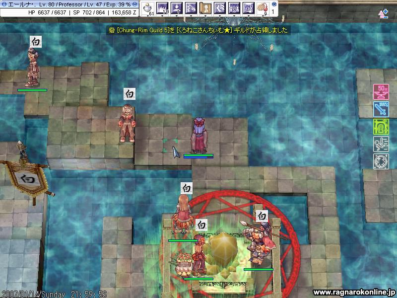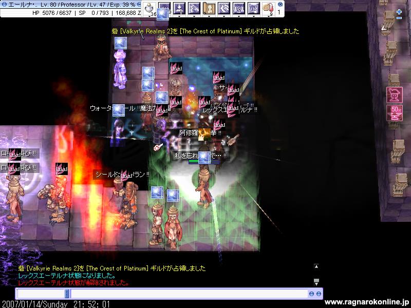 GSは白組、人数は10人くらいかな とりあえず点数を競うのですが、そこら辺はよく分からないので基本はいつものようにV5でした。別PTとしてAXの方がV2やV4を回っていたみたいです V5の内容はこれまたいつも通りで、ほとんどがGSとこっこのシーソーゲームだったような気がします 特に他のGの方たちも現れず私も暇をしていたのですが、、 今回は紅白戦ということもあり、他のとこをいろいろ回るお願いをしてみました そんなわけでだいたい9時半から10時半の1時間ほどを適当に回ってみることに 何やらブログ期待してるとか言われたので、ちょっと張り切ってSSをいっぱい取ってみようかと思ったのですが・・ 教授ソロだと何もできないし、速度もないので気づいたらあっというまに1時間。 とりあえずあやふやな記憶をもとに 最初は別PTの方を助けてみようかという感じでV4へ行ってみるのですが、特に私のやることもなくAXの方がささっとブレイクしてしまいます。 なので今度はV2で同じ白組であるただ商さんをちょっと手伝おうかなと意気込むわけですが! これまたすることもなく、入り口でディスペルをしていたり いてもいなくても変わらないなと思い、今度はベースで出るポタに適当に乗ってみる。 ついた先はCの砦。どこがどこだか分からないので旗を見て適当に回ってみることに 同じ白組を探してみると、誤字玉の人たちがいたのでそこをまたしても出しゃばる。 紅の人がいたのでその人にディスペルをしようとするも、何か誤字玉の人にやってしまったような気が・・ これはまずいと思い、役にたたなそうなので結局は適当な砦へ突っ込むことに ここでようやくSSを取ることが出来た! 死ぬとこですけどね。 何だかもうめんどいので全部割愛! 無駄になってしまったような1時間でした。 そして残り30分は再びV5へ 特に大きなとこが来るわけでもなく、最後までレースでした ラスト10分くらいでGSは確保したようで、残り4分くらい?でブレイク そこからはラグ防衛に 終了間際のSS! ということで、見事GSは初めて?砦を手に入れたのです! (何か書くの面倒なので最後のほうかなり適当。 Gv終了後、エンペ周りでGSだけのSSと、V5入り口でレーサーのSSを取りました。 G狩りに参加