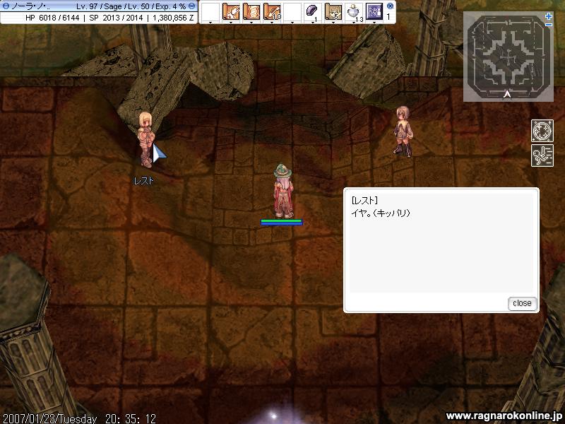 当然セーブポイントに戻されるわけで、Inした時にはリヒに舞い戻っていました 普段は夜の時間帯は避けている生体ですが、これは行ってLv上げてこいというお告げだと信じて行ってみることに 夜独特の重さはあるものの、何とか狩りは出来ている感じ しかし1%増えた辺りで、ちょっとしたアクシデントにより死亡 再度リベンジするものの、こっからがすごかった。 1回目の生体では何ともなかったのですが、この2回目からはかなりラグが連発 ラグというよりかは重さなのかな? 勝手にメンテ後だからなのかと思っていましたが、他の人たちは普通に動いている様子 なぜか自分だけが全然動きませんでした PCが悪かったのかな? まぁそんなわけで当然デスペナを貰うことに ペナを取り戻したいとは思ったのですが、生体じゃ増やすだけだろうと思い今度は久しぶりに窓へ行くことに そんな時、途中カタコンに現れるミーナとレスト ミーナは5kで支援を貰い、聖水と青Jと矢を売ってくれる 5kって確か増えてるよね・・? そしてレストはよく分からなかったけど、話しかけてみるとどうやら属性付与をもらえるらしい 当然セージがもらっても何の意味もないけれど、ここは素直に頼むべきだと思い選択をしたみた。 そ、そりゃないよ・・ 後で教えてもらったら、どうやらレベル制限があったらしいです。 それならそうとちゃんと言ってよね! そんなわけで帰ってきました 私のマイホーム しかしここで手厚い歓迎が・・ 窓でも起こる強烈なラグ やはり私のPCか何かがおかしいようです とりあえず窓なんて楽だと思っていたのですが、かなり死の危険に晒されました よって本当に死ぬ前に帰還することに! 恐らく長い間家を離れていたがために、友達のスティング君は拗ねていたようです! これに懲りて私もちょくちょく遊びにいくことを固く決意いたしました。 今日も何もないだろうと思うので、昨日忘れてたGvを!