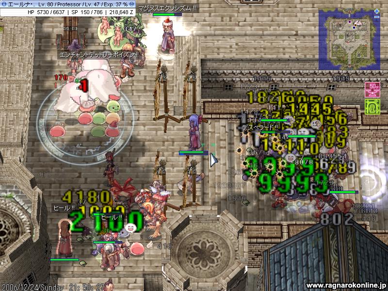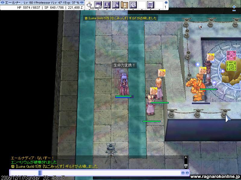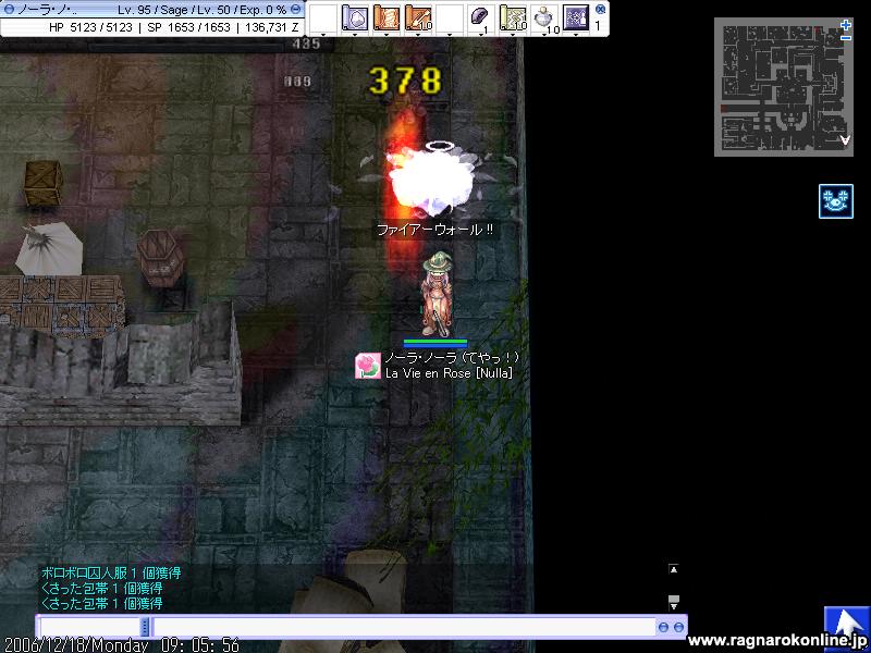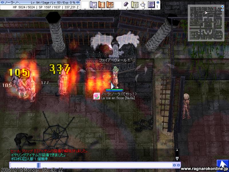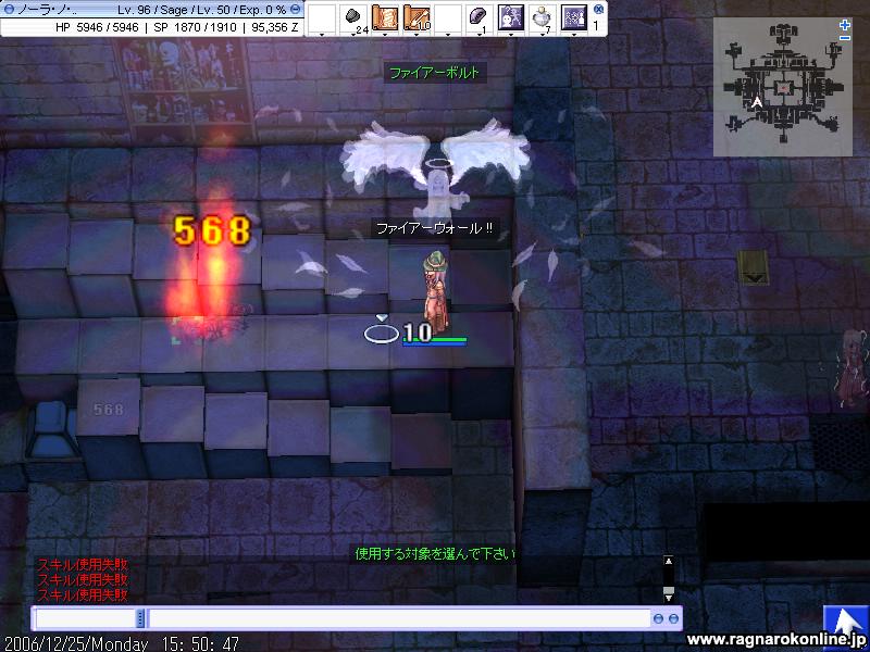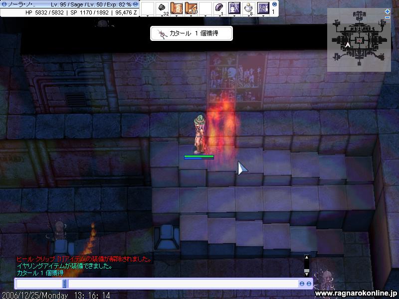 改めて何を言うまでもなく、死にまくりです しかもなかなか敵と1対1に持ち込めず、30分うろうろなんてこともよくあったり ここら辺が運ということなのでしょうか 階段も他のPTに占拠されたりでなかなか定点とかが出来ませんね 延々とテレポばっかです 基本深夜メインで狩りしてますが、今日は昨日よりも人が多い。何でだろって思ったら今って冬休みの時期なんですかね・・ とりあえず1週間ほどは通いつめてみますが、多分監獄で狩ったほうが全然早そうです・・ とりあえず狩る敵にLKが追加 時々地属性チェンジしたまま他の敵に襲われ放置にしてしまったかも(汗 阿修羅さんが倒してることに期待。 それと地コンバーターOR硬い角が余ってる人いましたら、良かったら売ってくださいませ 本日はGvの日でございます