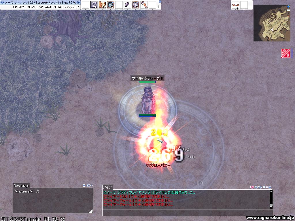 やっぱり兎よりは婆のが安定して狩れるかなー ただ体感的に婆の数が一番少ない気がする しかもアスムかかると、ディスペルで切れない?さらに接続時間過ぎてエフェクト切れても、効果が続いてるのかな? まぁどっちにしろ、周りに他の敵がいない状態に持ち込むには運が一番左右されるんだけども・・ 婆に関して言えば、互いにヒールし続けるから、2体でも楽に一緒に倒せます 後はちゃんとドロップにレアアイテムもあって、兎が帽子を落としたことにびっくり。 どうせ帽子だし、どうせ兎だし、期待なんてしてなかったけれども やっぱりマグニキャップとかでした。 結局兎の後は婆に変えて レベルアップ! 103/41です 今月に110いきたいとこだったけど、多分ペース的にちょっときついかなぁ 最低でも105はいきたいし 後は教授もほんとあげたいから・・、多分兎は狩れるんじゃないかと思うので。 ただし、ジョブがジョブが! 一体100kちょいもらえるけども、報酬にはジョブ経験値ないし さらには保険証切れた後にたまに死んだりしてたら 普通にジョブマイナスで0%になってた。。 ビフロストで精霊が来ると妄想してるから それまでに50、最低でも45にはしたいなぁ・・ 無事に婆も倒した後、今度は兎にチャレンジ。 兎は出会ってからまずFDをして、そのすぐ後にTS、それからFblをするみたい。その後はFDに戻るのか地魔法するのかは分かりません で、詠唱時間は長いので、その間に飛べるし、攻撃で詠唱中断も可能。 皿にいわせれば、スペルブレイカーとマジックロッドやフリーキャストで、さらに防御できます だいたい、出会いがしらにFW、FD詠唱→MR、TS詠唱→Spb(避ける)、移動しながらもFbl詠唱→MR、この辺りでFWに乗ってくれて、後は自動的に詠唱中断。たまにFWあたらないで詠唱してくるけども、そこはよく見てキャストキャンセルからMR。 と、地属性低Mdefなので、倒す時間だけでいえば渓谷の中で一番早い敵 だけども、FW乗るまでがちょっと時間かかる?慣れが必要なのかなー あとはDDすると、冷凍の影響?かテレポ持ちがたまにテレポしてくのがよくわからん・・ とまぁなんだかんで1時間くらい?で15体だったのかな。 慣れたらもうちょい早いペース? 完全にムカーに出会ったらテレポで逃げるしかないけど、 他3体はくも飛ばしで何とか処理はしつつ、基本タイマンって感じの狩り方。 アラームはSppを気にしつつのFWの距離を保つのが面倒。でもMAPで一番多い敵。だけど倒すのは20体。この5体はやっぱり大きい 婆はFW乗れば遠距離ないから安全だけども、アスムと9999ヒールがちょっと面倒。さらには闇属性に高MDEFなので、倒すのに時間がちょっとかかる。 兎は一番早く倒せるけれど、FW乗るまでが死の危険が一番多い。FDで9k~11k。即死率は高い どれが一番の20Mへの近道なのか・・・・