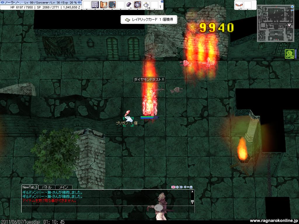 どれくらい集まるのかなーって思ってたら8人くらいで結構面白い感じでした。 参加したのがRK1LK1狼1羽1WL1忍1修1AB1影1でうちの皿1かな? ラストがEMCのためマスターさんがABからメカになって修がABに。 最初にCからいってLとかVとかBとか結構回りました 記憶の片隅にある2つの新砦はいかない方向なのかな? というか私も一度たりとも行ったことありませんがー やっぱり単体のレーサーとかはほとんどいない印象1PT内のGがちらほろ あとは2PT以上のGや連合とか? 今日はほとんど大手みたいなとことはかぶらなかったです 皿のやることもやっぱり足止めメインなんだけど、後衛の位置でやってるとWLの魔法とかほかの3次のスキルやらで即死が当たり前な感じ。 対人用でもないので、HPも7kとかしかないけど、これだと10k前半でもたいして変わらないのかな? まぁあんまいいSSもれぽも無理でした ラスト30分前くらいでいろいろ偵察にいったのですが L1にいったら修羅1人だけいて、皿と羽でたたいてたら見事にブレイク 今日一番のうれしさ。 で、ラストはB1にいくことに でもどこも来ないでそのまま終了ー 無事に砦ゲットでした。 大して役にもたってないですが、お疲れ様でしたー 課金したものの、やっぱり皿のやる気はそこまであがらず